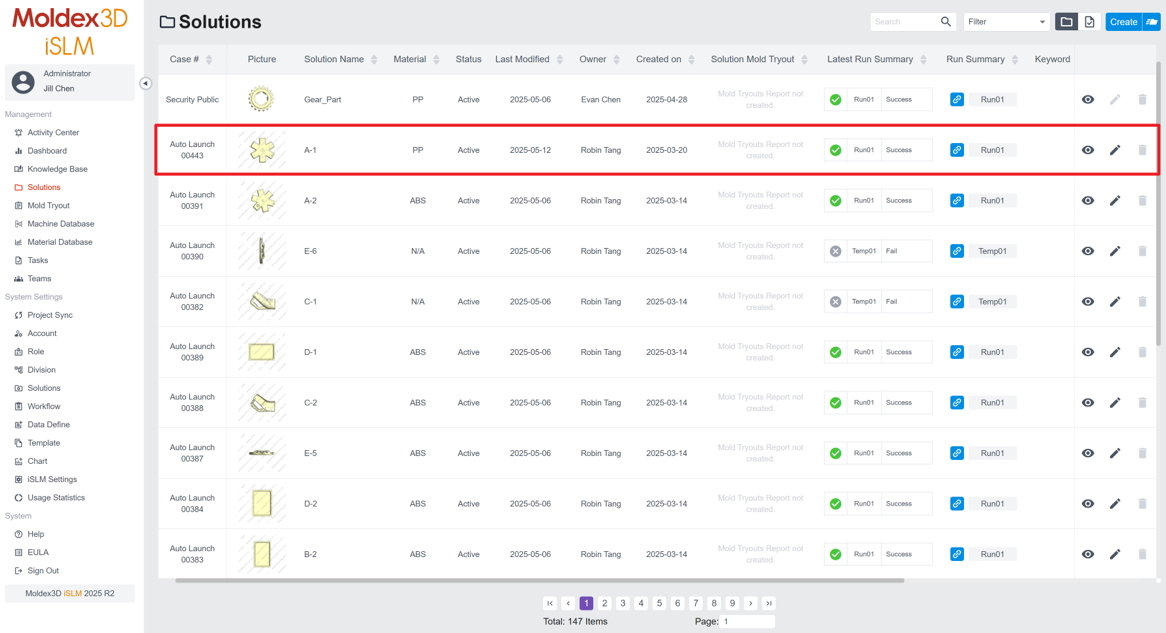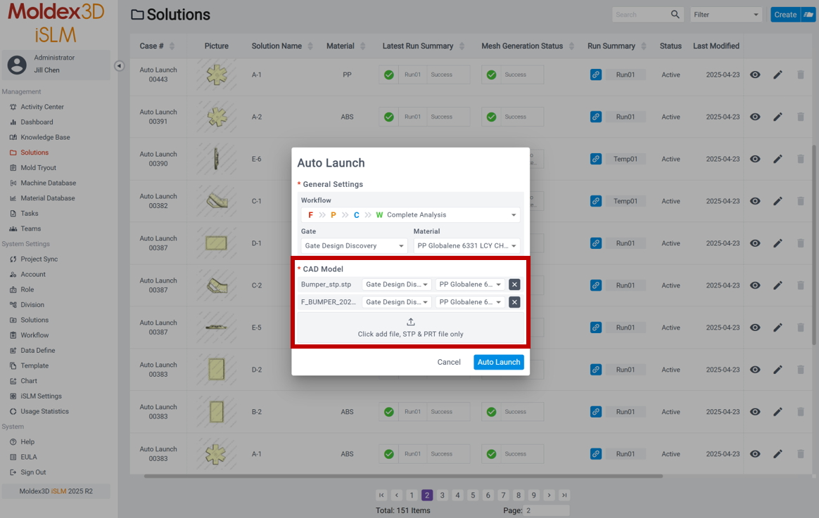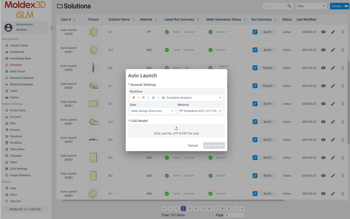 Moldex3D iSLM 的專案管理,提供使用者一個完整且有系統的架構,讓整個成型開發的流程得以詳實地記錄並整理於個別專案中。為了提升建立專案的效率與便利性,iSLM 在 2025 年正式推出自動創建專案 (Auto Launch) 功能。除了可透過原有的手動方式建立專案,使用者現在亦可選擇使用 Auto Launch,僅需上傳 CAD 模型,系統便會自動建立專案。
