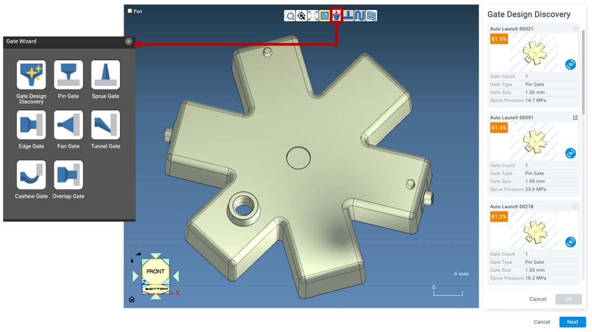 當選擇 Gate Design Discovery 建立澆口,在進行澆口設置的模擬分析流程時,系統將以模型檔的相似度自動決定最佳澆口位置。另一方面,若選擇手動方式,在進行澆口設置的模擬分析流程時,使用者須至工作清單頁面中點擊設定模型澆口按鈕,並於澆口精靈 (Gate Wizard) 面板中決定適合的澆口類型及澆口位置。不過在此步驟,使用者仍可透過Gate Design Discovery功能檢視建議澆口清單,以協助設計決策。