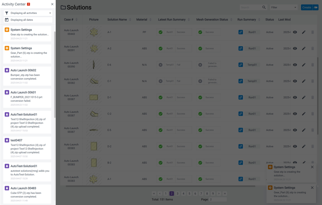開始執行 Auto Launch 功能後,使用者可在活動中心檢視專案創建以及分析過程中的所有通知訊息,包含模型上傳成功與否、澆口建置狀況,到分析進度百分比等等,確保使用者能掌握即時資訊。