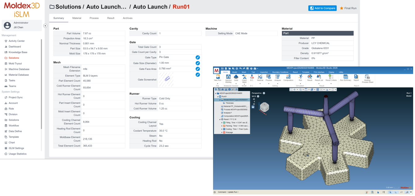 系統完成分析後,專案即自動創建完畢。使用者可透過專案內的 Moldex3D 專案查看詳細的分析結果,並進一步檢視澆口設計及相關成型參數,以利後續調整與優化,透過自動化的工作流程提升工作效率。