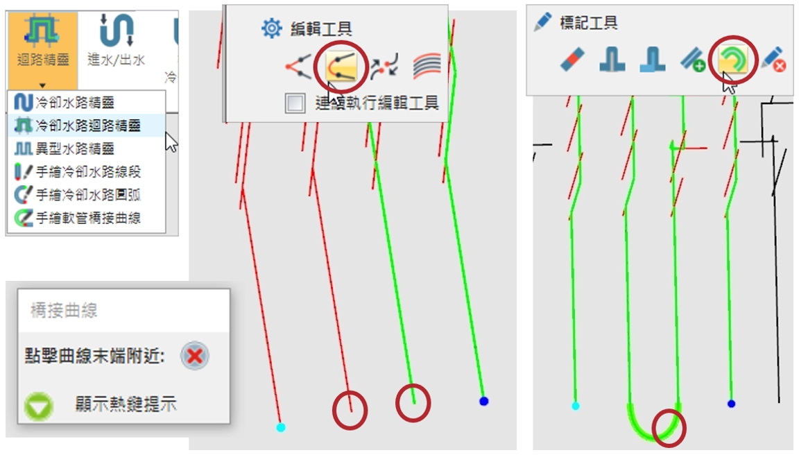 若因中間缺少外部相接曲線,而使自動產生的水路(綠色線條)無法連接到出水口(青色端點),使用編輯工具中的橋接曲線來連接紅、綠兩個水路群,選取要連接的兩個端點,完成後會出現彎管線條,將斷開的水路群組加以相連,成為連續水路。另外,透過標記工具中的標記軟管,可將該彎管線條標註為軟管水路,完成後該線段會以加粗的綠色軟管顯示