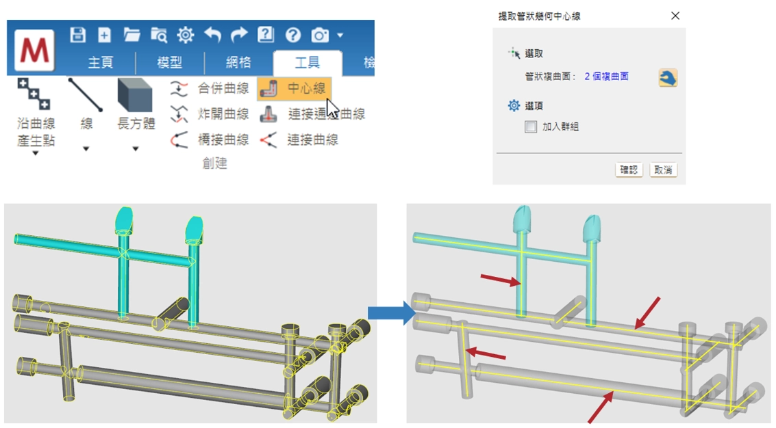 匯入幾何後,在建立水路前,先使用工具列的中心線來萃取模型中的3D實體水路幾何面,擷取所需的水路幾何線條。點選中心線並進入建構中心線的介面後,框選要萃取中心線的實體水路曲面群,也可以一次框選多個實體水路曲面群,框選好之後點選確認,即完成中心線萃取(右下方圖中的黃色中心線條)。