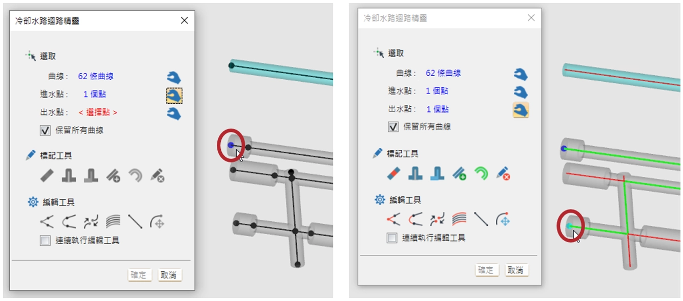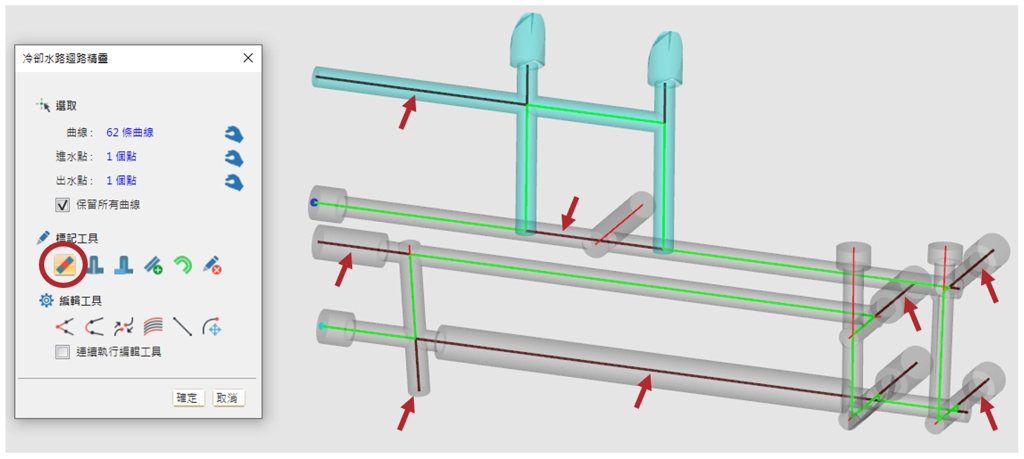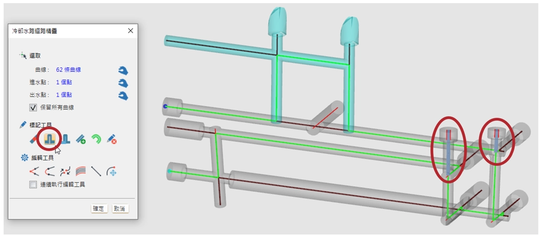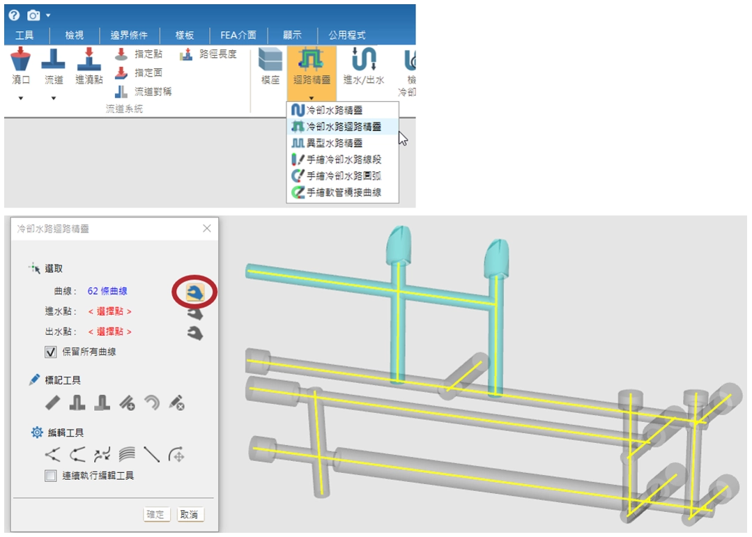 冷卻水路迴路精靈提供標記/編輯工具