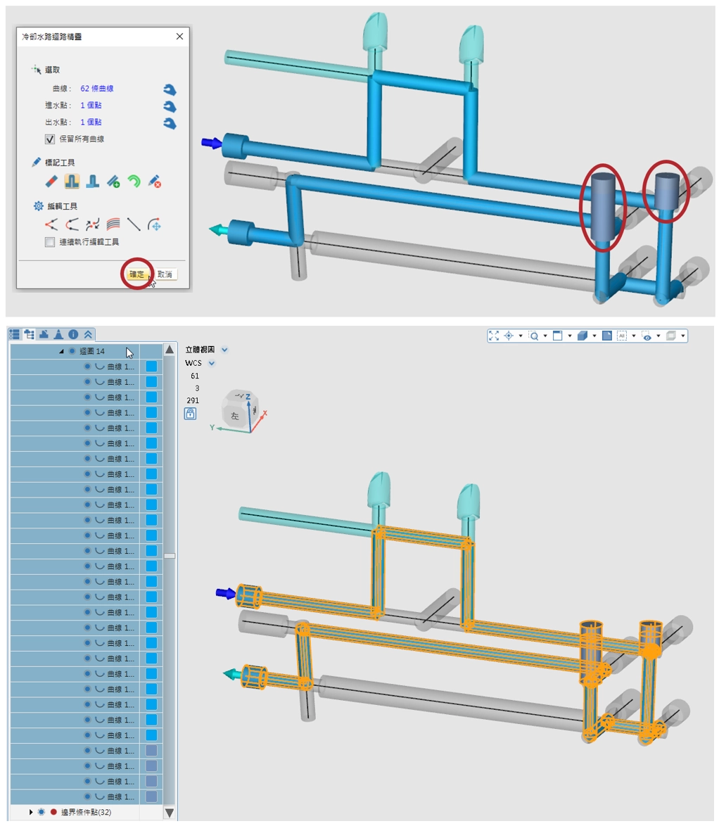 標記完成後,點選確定,即可看到設定完成的水路及進出水口位置,並自動歸組到冷卻水路中。